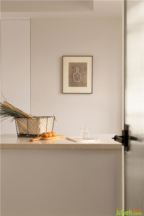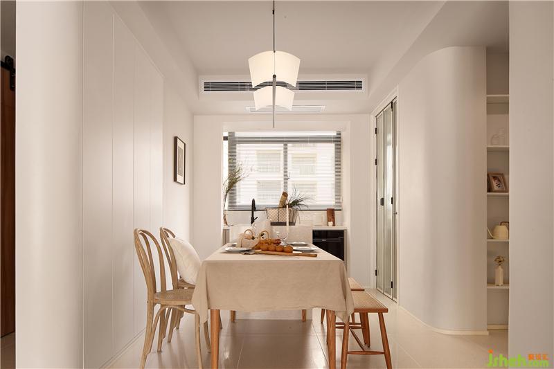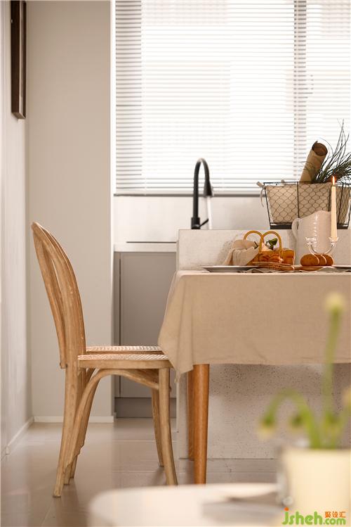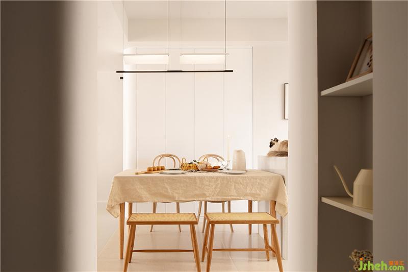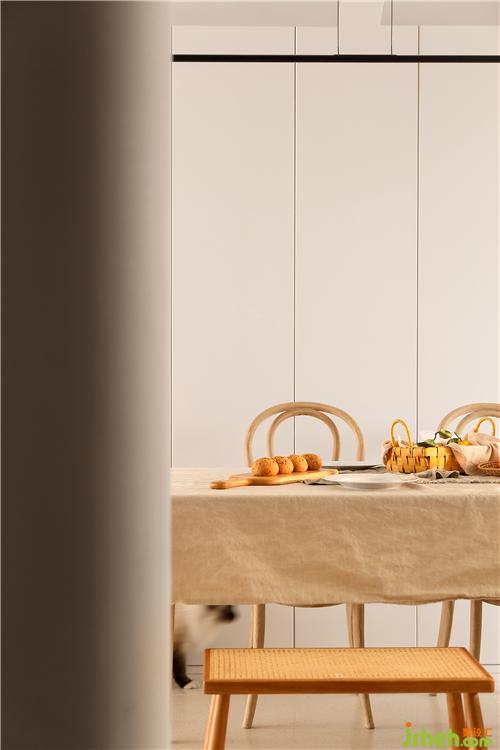 通过玄关就来到了餐厅,餐厅采用餐桌+两把靠椅+两把条凳的组合方式,使空间看起来不死板,没有靠背的条凳也会更节省空间。餐桌椅选择了原木材质,搭配上藤编的工艺,南京室内设计师自带一种质朴随和的气质,在光线的晕染下,整体散发出复古韵味。餐桌铺上一块奶咖色的餐布,营造出温暖、有活力的氛围,更能增加食欲。餐椅后面的墙体拆除后,定制了一排暖白色的储物柜,转角处同样采用了圆弧处理,增加收纳的同时又使空间显得更轻盈明润。