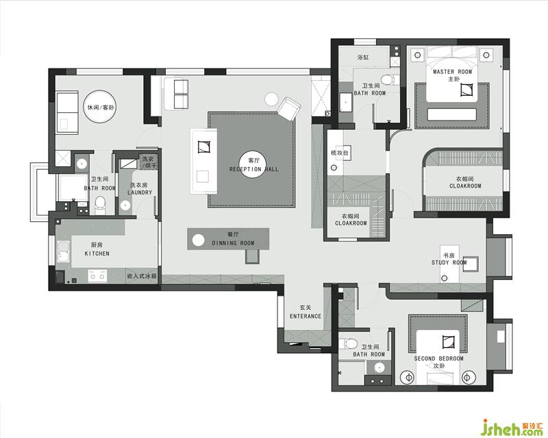 8.客厅与主卧之间的墙体整体优化,分别设计了公共的衣帽间和化妆间