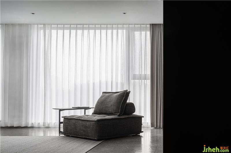 客厅的沙发由三块可移动的单人沙发所组成,可随心意摆放在任一角落,半躺的设计有助于压力的释放,在这宽广的客厅空间中最适合不过了,灰色与米色的搭配也更显高级感。地上铺上一块浅色的棉麻地毯,带来一份温润与清新。