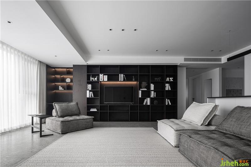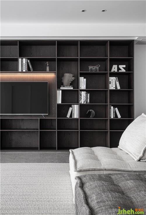 整面的开放式书柜,满足了屋主爱看书的习惯。将电视内嵌于其中,满足多种功能需求。
