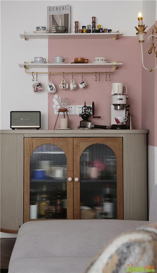 餐厅一角选购了一款浅灰色餐边柜,优雅的外观造型,为空间平添了典雅的浪漫气质。墙面安装两块ins风搁板,精心搭配出一种复古文艺风的小确幸,在清雅的撞色下,烘托出如诗的惬意。