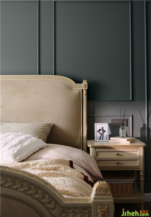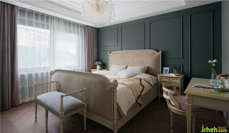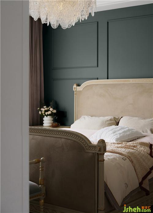 透过卧室,大胆的配色带来了飘逸的儒雅感,灰绿色打破了空间的沉闷,使空间散发着高贵浪漫的气息,完美展现屋主的精致感。
