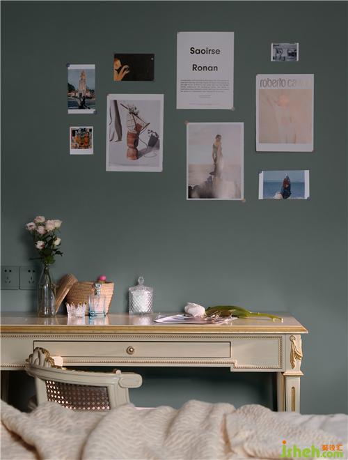 卧室一侧购置了一款米色梳妆台,时尚的外观,巧妙的储物空间,让居室拥有意想不到的温度与气质。墙上粘贴了diy海报照片墙,错落有致,协调统一,时尚韵味十足。