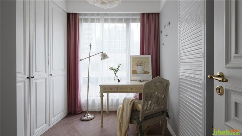衣帽间,留白墙面搭配白色储物柜,空间更显轻盈明润;配合上粉色的窗帘,整体更加干净通透,散发优雅气质。