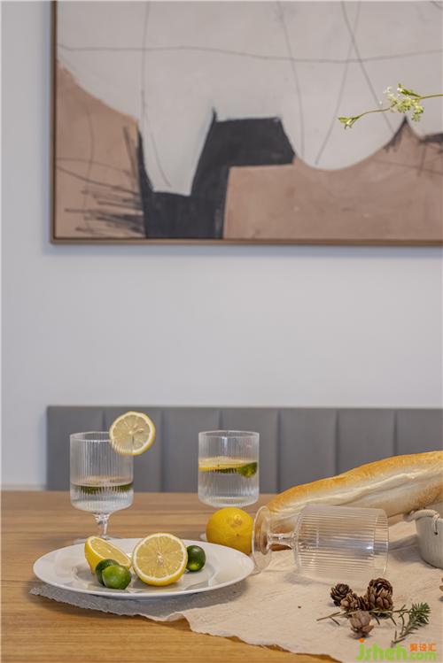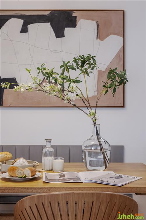 餐厅选择明亮清新的白色、原木色构成整个空间的色调。家具上选购了原木色的长方形餐桌和扇贝椅,尽显实木的温润质感,典雅与柔美并存,南京室内设计师塑造出温馨别致的居室美感。另一侧设计了卡座的形式,增加收纳空间,舒适与实用相结合。装饰画的色调与空间相匹配,给整屋增添了艺术气息。通往厨房与卫生间的过道门洞,分别以拱形和长方形的形式表现,为空间注入别样的活力。