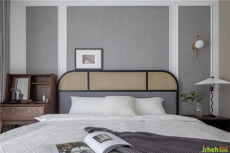 主卧选购了一款千鸟格软包结合藤面的床,时髦与自然的融合,黑、白、木就像一件优雅的“小洋装”,搭配纯白的床品,打造复古雅致、自然惬意的小空间。