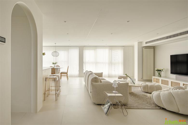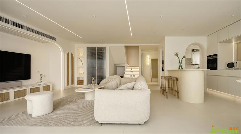 客餐厨一体的布局,使客厅、餐厅和厨房有效结合,更具空间感和整体感,视觉上更显通透和宽敞。地面整体铺贴奶油色地砖,与墙面、顶面融合为一体,纯粹的色调,南京家居设计让空间多了更多静谧与自然气息。