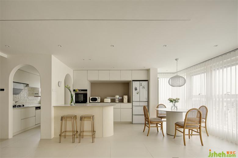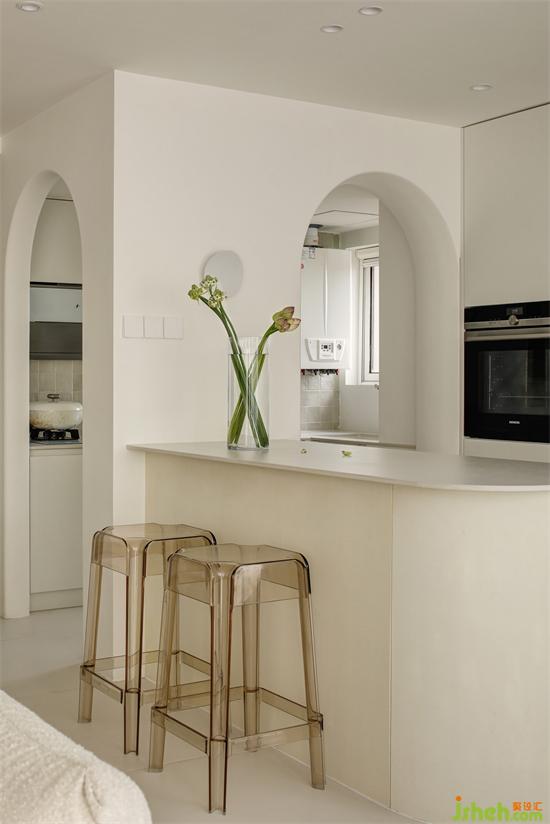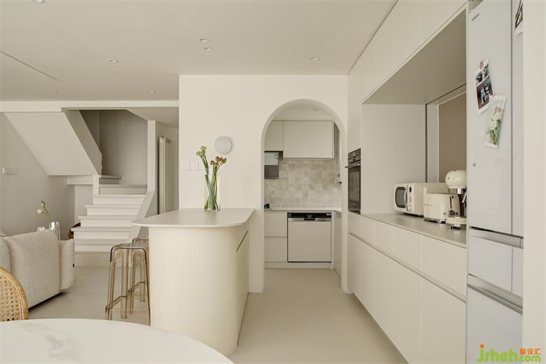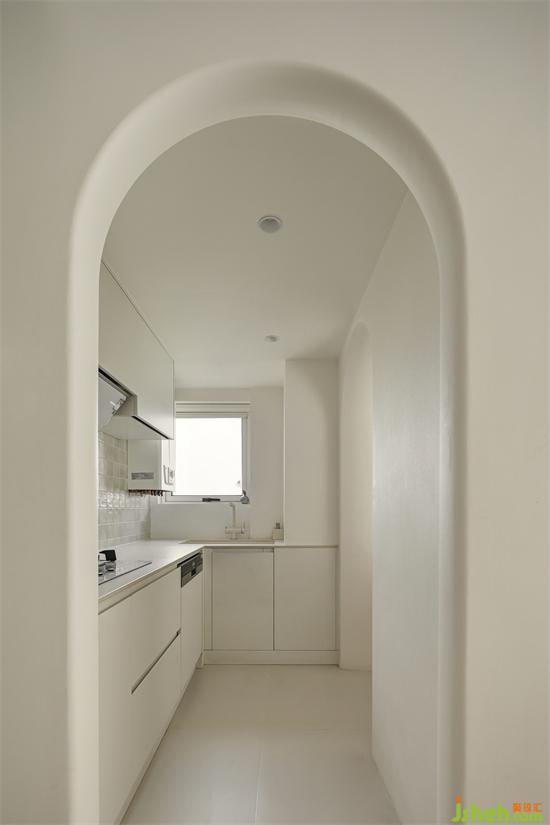 客厅通往厨房的门洞采用拱形的设计,南京家居设计保持空间的流动性,圆润柔滑的线条,配合上奶油的色调,带来丝滑的质感。厨房内部也是满满的奶油色,灶具的那面墙铺贴了100*100的小砖,自带渐变色,与奶油色的橱柜完美融合,带来温柔高级的气质,在这样一间充满治愈色彩的空间中烹饪美食,也会松弛得让人心情十分愉悦。