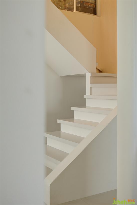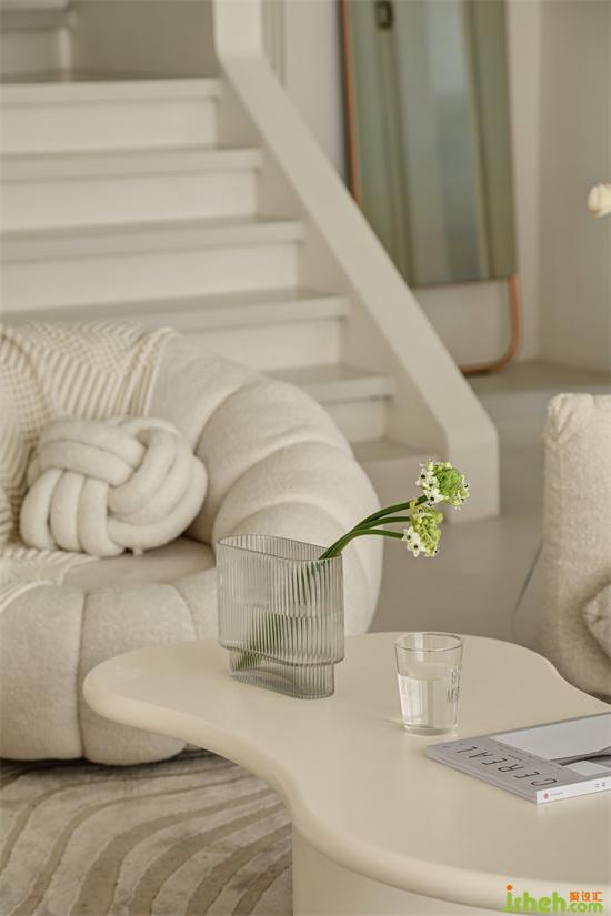 客厅一侧可直接上到楼梯,在保证基础的行走功能下,也是室内的一处造景。踏步采用石材的材质,上半段增加玻璃扶手,南京家居设计使空间更加通透,色调与整屋配色相统一,更好的作为楼上下的衔接,简约中透射着美好与纯粹。