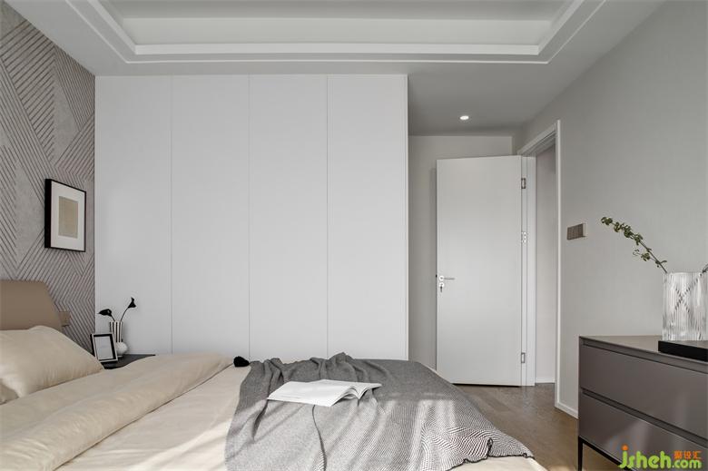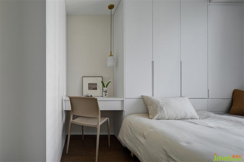 次卧购置了一款无靠背床,简约雅致,无靠背的设计可以紧贴柜子放置,为卧室节约更多空间,南京家居设计给床尾留下更多的走动空间。床头定制了白色的储物柜,与白色的衣柜相呼应,简约时尚,收纳与美观兼具。储物柜和衣柜之间定制了挑空的写字桌,悬空的设计,为空间增添了轻盈感;搭配一款精致的小吊灯,营造出一种静谧的氛围,满足屋主简单的办公需求。