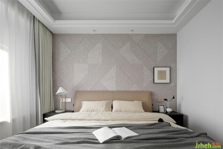 燕麦色的真皮床,纯粹简约,带来一种素雅柔和的感觉,饱满柔软的靠感,南京家居设计让倚靠更加舒心。床头背景墙铺贴了浅灰色的几何状墙布,无限延伸的线条,纵横交错,形成立体的视觉效果,理性的图形及色块营造出高级的质感与氛围。一幅装饰画点缀其中,带来一份美好与品位。