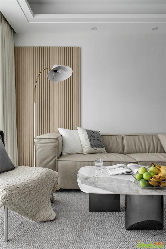 沙发扶手旁配置一款落地灯,白色的铁艺灯罩,与家中色调相融合,南京家居设计倚靠沙发或者休闲椅上都可以辅助我们的阅读,简约中呈现出一丝美感。