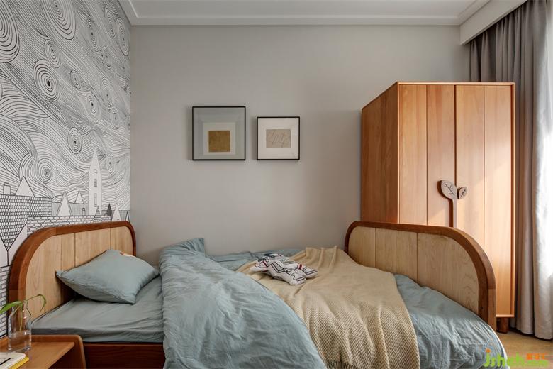 圆头圆脑的儿童床,可接触区域都做了圆角处理,安全陪伴孩子的左右。床头铺贴了一款卡通壁纸,丰富的图案显得既舒适又和谐,童趣味十足。南京家居设计浅灰的墙面点缀两幅抽象挂画,提升空间的艺术品味。衣柜购置了一款900*530*1900mm的尺寸,搭配萌芽造型的拉手,带来更多趣味性。