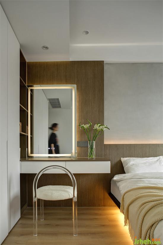 木质背景墙的设计描绘出空间的素雅、质朴和自然之特性,使卧室更具温柔与恬静。白色衣柜与咖色开放格的组合,收纳与展示兼具;延伸出一个梳妆柜,梳妆台下面留出放梳妆椅的位置,不仅节省了空间也更具整体感;南京装修设计搭配一款透明梳妆椅,极简中透射出时尚的美感。