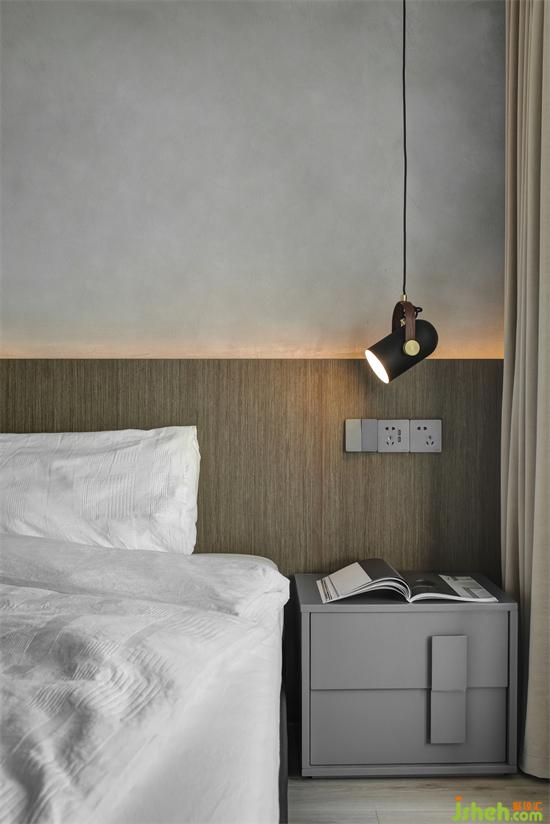 床头一侧安装一款吊线灯,不占空间,方便夜读、玩手机,南京装修设计又增加了空间的层次感。灰色的床头柜,外观时尚前卫,带来一种稳重、宁静的时髦感。