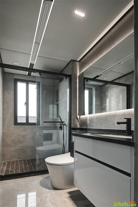 卫生间干区:台盆区、马桶区,湿区:淋浴区,做好干湿分离。配色上以灰色调为主,南京装修设计通过不同灯光的照射,体现空间的干净整洁,营造出高级、舒适的感觉。