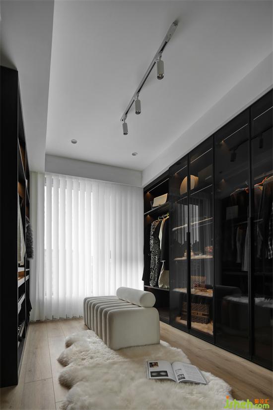 衣帽间安装了梦幻柔纱帘,光线透过纱帘照射进屋内,带来朦胧的光影美感,感受线条的秩序美;南京装修设计巧妙运用玻璃、金属、木质等材料来拓宽视觉感,结合光线和灯光来表现光影的和谐。根据挂衣区、叠放区、鞋包区的分配,分别采用开放式与封闭式结合的收纳方式,让衣帽间繁而不乱,井井有条。黑色在光影的映射下,彰显了整体的品质感,配合上丝绒的软垫和毛茸茸的地毯,也能让屋主保持愉悦的心情。