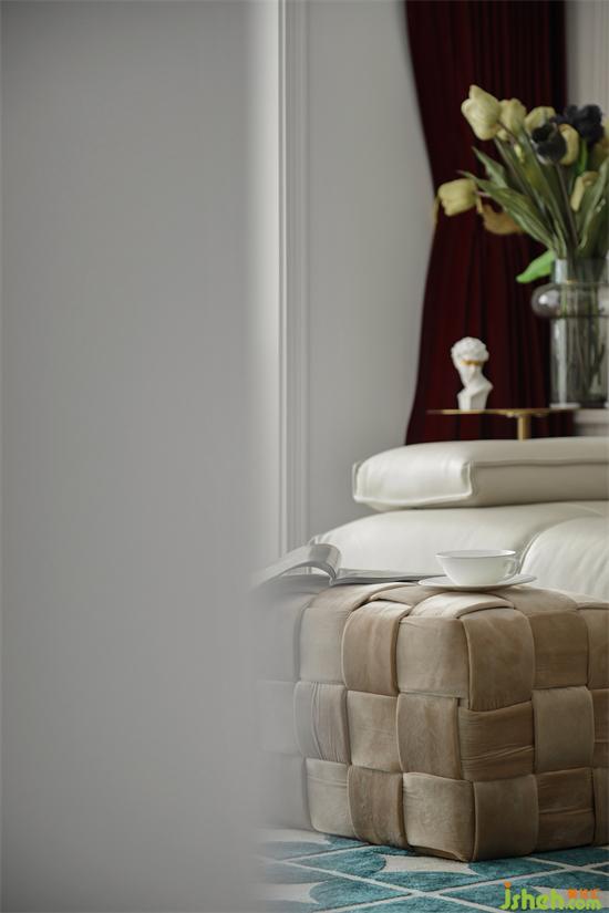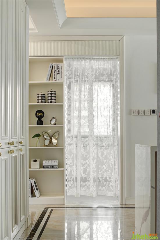 入户左侧定制玄关柜,顶天立地的设计,白色与法式线条的融合,实用又美观;南京公馆设计配以金色的金属拉手,增加轻奢质感。走廊尽头定制开放式的展示柜,摆放装饰品、书籍等,提升空间的艺术品味,适当的开放式展示架又能增添层次感和轻盈感,给人一种灵活多变的空间效果。与厨房之间采用门帘做隔断,既节省了厨房空间,又很好的将两个空间独立划分;精美的蕾丝花纹,柔化了室内的光线,为屋内带来温柔的法式气息。门头处设计了波浪纹的造型,为屋内增添灵动的视觉感受。