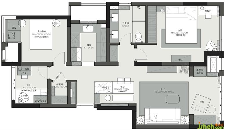 该南京公馆设计项目位于南京江心洲的保利紫荆公馆,建筑面积99㎡,精装交付,户型为三室两厅一厨一卫设计。客餐厅连接向南阳台,采光充足。屋内有一间储藏间,可以作为家里杂物的收纳。除了主卧,其余两个卧室较小。