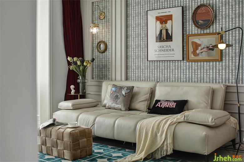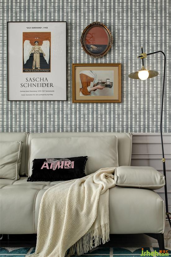 客厅的沙发背景墙采用护墙板的南京公馆设计,通过线条的点缀,提升了墙面的立体感;中间留空用壁纸充实空间的色彩与内容,暖灰色护墙板搭配上复古的花色壁纸,再配以复古的装饰画,装修使得空间在温柔中散发着浓厚的时尚复古气息。