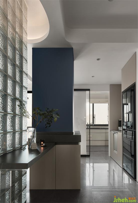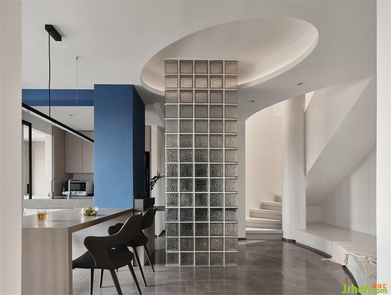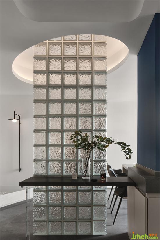 顶面设计椭圆形吊顶,利用玻璃砖作为墙体隔断,提高了空间的设计感。