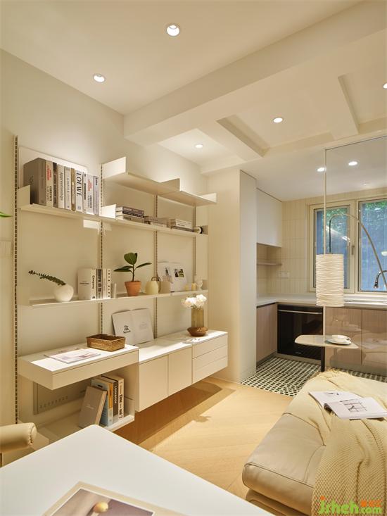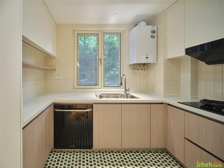 吊柜、落地柜和层板满足厨房的收纳所需,整体采用浅色基调,暖白、米白和木色的搭配,给人明亮温馨的视觉体验。