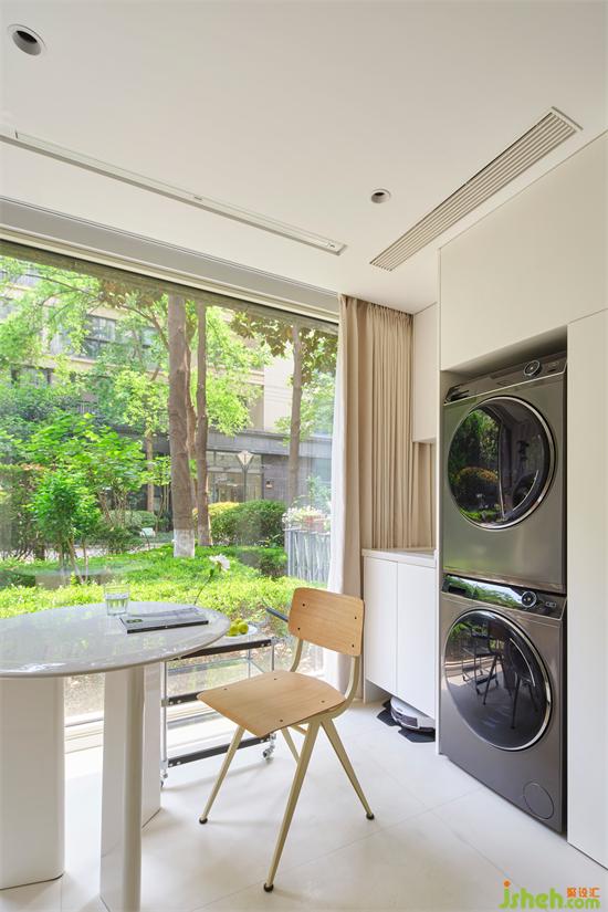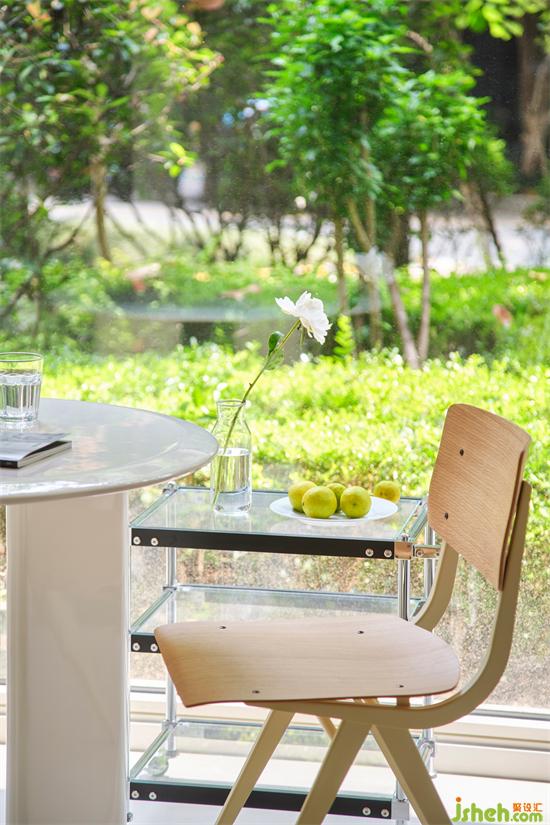 客厅与厨房之间通过玻璃隔断分隔,实用与美观兼具,光线从玻璃中肆意穿梭,南京银城聚锦园家装设计改善空间采光,开放式厨房的设计又让空间更显大,带来隔而不断的通透感。