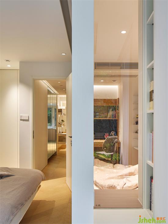 从走廊可进入卫生间和儿童房,儿童房定制玻璃移门,开门不占空间,保证空间的利用率,营造出一种透光不透色的朦胧美感,南京银城聚锦园家装设计同时还能缓解小空间的压抑感,在视觉上看起来更加敞亮。