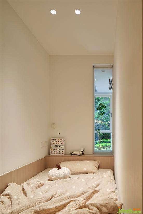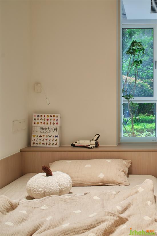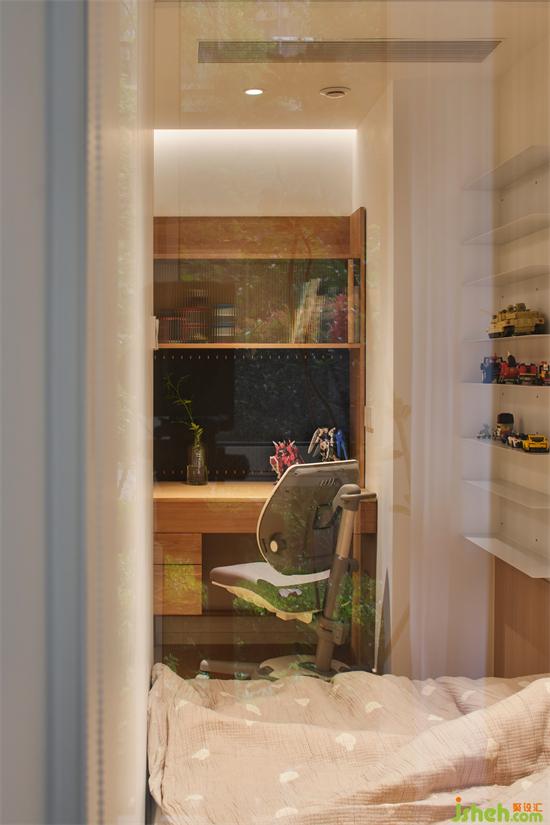儿童房由原卧室隔出的一个空间打造,与阳台之间通过透明玻璃隔断引入采光,南京银城聚锦园家装设计解决了暗间的问题;暖白色和自然木质在柔和的光线下变得温暖。