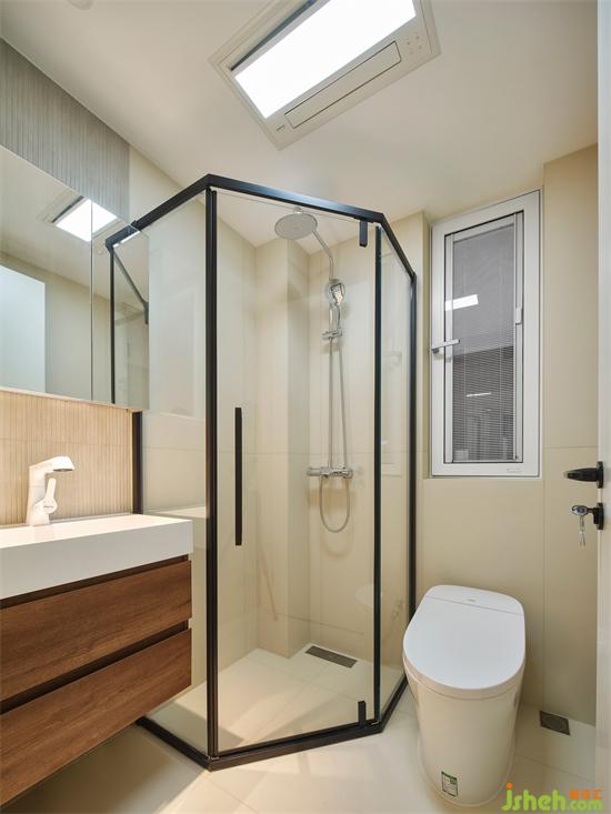 卫生间利用玻璃淋浴房形成干湿分离,简单干净的米白色瓷砖,在洗手池背景用细条纹砖作点缀,南京银城聚锦园家装设计搭配深咖色的浴室柜,营造出清新恬适的卫浴空间。