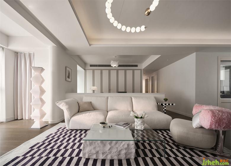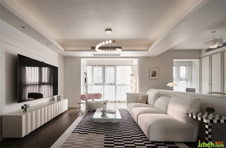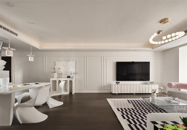 客厅空间以温润的奶白色为主色调,将现代风格与法式元素相融合,南京世茂璀璨江山精装房改造打造出温柔治愈又有高级感的家居空间。