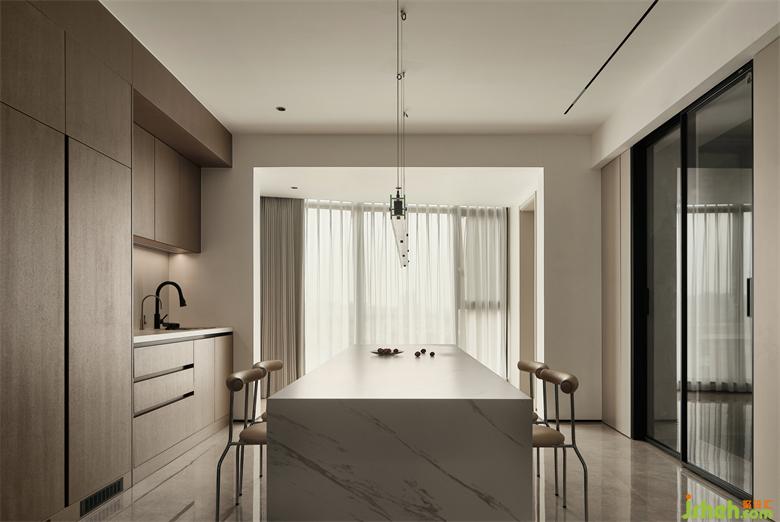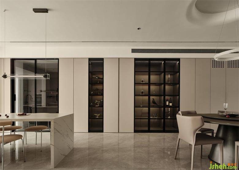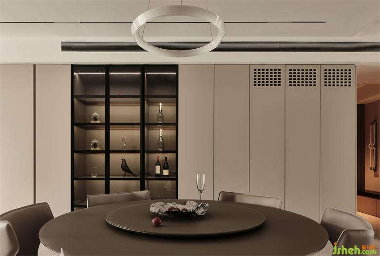 餐边柜、封闭式柜体与展示储物柜的组合,展示柜兼具酒柜的功能,展示收纳两不误,充足的收纳储物空间,保持了空间的简洁与实用。