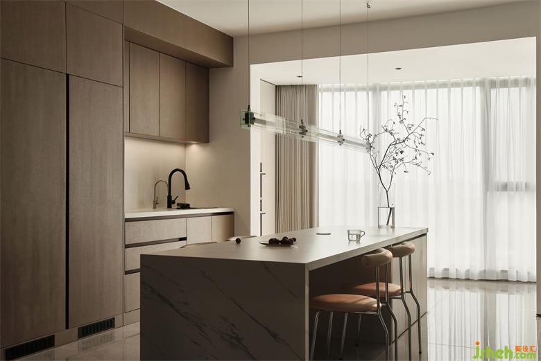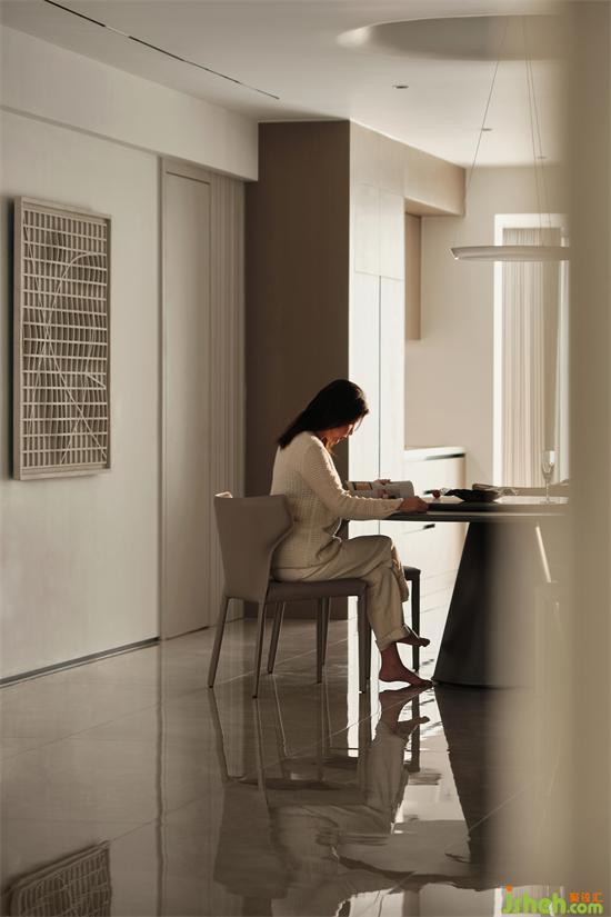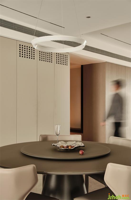 圆形的餐桌让用餐更有氛围,无形中拉近了家人之间的距离;南京藏龙御景家装设计顶面圆形造型的加入,表现出空间独特的艺术美感,下挂圆形吊灯,又与圆桌形成呼应,在流畅线条的回旋间营造出一种摩登时尚的氛围。