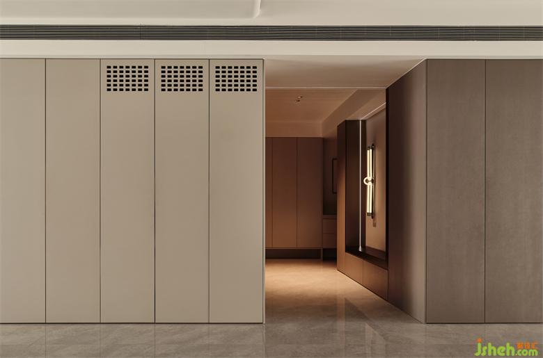玄关左侧定制了一组顶天立地的储物柜,大大满足了收纳所需,底部留空一层,方便放置当季的鞋子;整面的暖灰色显得更加清爽洁净,带来一份平静的舒适感。