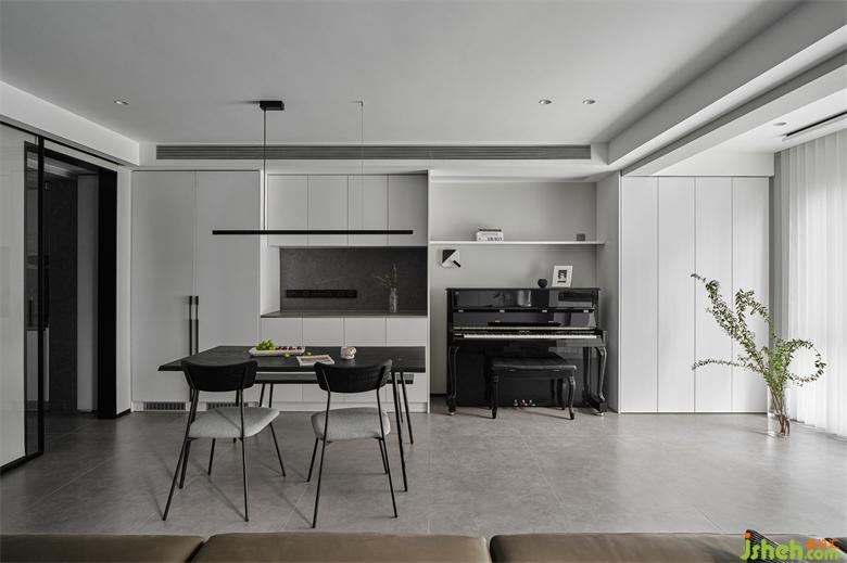 开放一体的客餐厅空间,统一连贯的装修风格与色调,给人一种视觉上的扩容效果,增加了空间的互动性。南京中航樾府家装设计靠墙布置一架钢琴,不仅能在家中演奏优美的音乐,还能散发出一种特殊的文化气息,音乐响彻于屋内,在这开阔的空间之中,更有助于聆听。