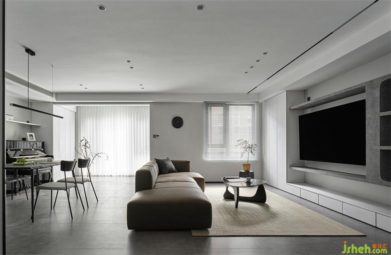 电视背景墙采用隐藏式柜体+展示+电视的组合搭配,让整面墙看起来更整齐划一,用马来漆涂刷打造的开放格,大面积的白色隐形柜体,更具层次感与高级感,给人一种纯净、舒适的感受。