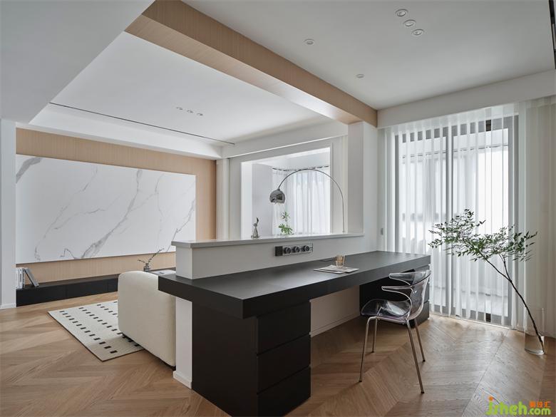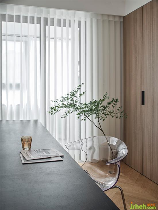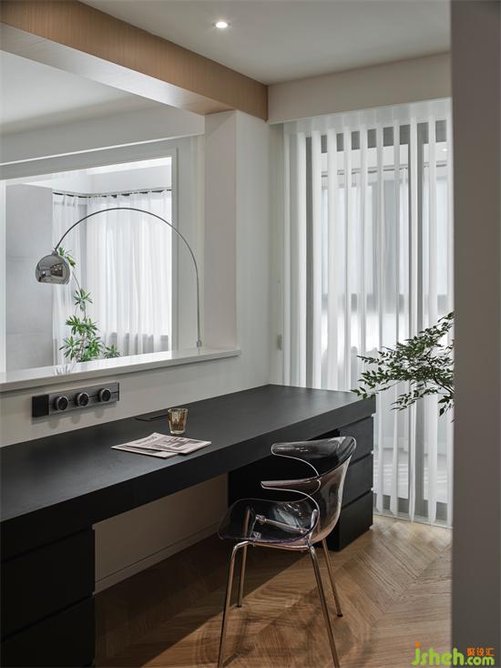 开放式书房的设计,与客餐厅形成环游动线,各空间交流无障碍,南京珑玥名邸精装房改造赋予空间通透感。书房与阳台之间搭配了梦幻帘,轻柔飘逸的薄纱材质,柔和过滤强烈的太阳光,兼具美观雅致和确保私密于一身,营造静谧的工作学习氛围。工作区背面沿墙体定制一排储物柜,可以将一些小物品和杂物放在这里,保持空间的整齐划一,原木色显得自然温润,带来一份温馨舒适。