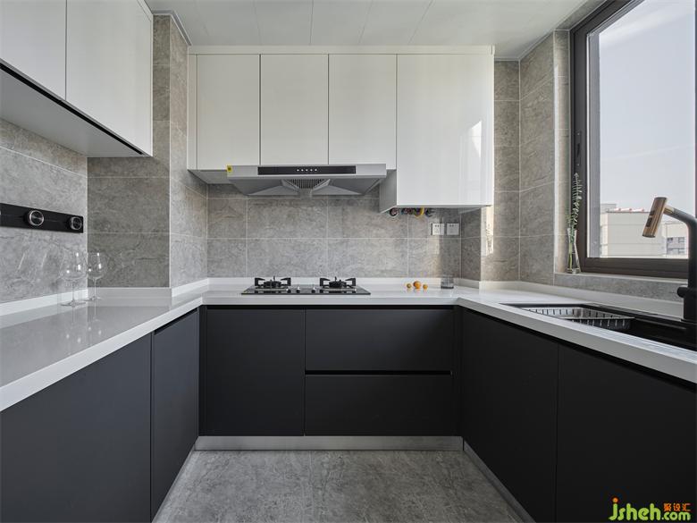 沿厨房的三面墙布局,形成一个“U”字型,为放置电器、多人同时备餐提供了更充裕的空间,操作面最大、动线最短、空间利用率最高。南京珑玥名邸精装房改造采光充足的厨房空间,橱柜采用白色吊柜+深灰色地柜的搭配,明暗色泽对比愉悦,清新中凸显沉稳,更显简约风格气质。