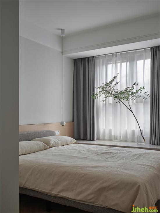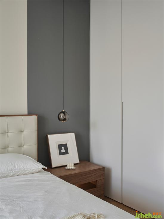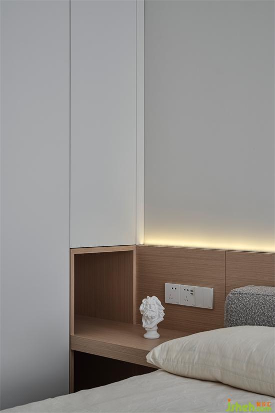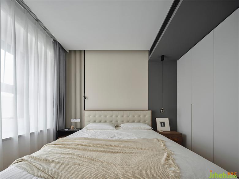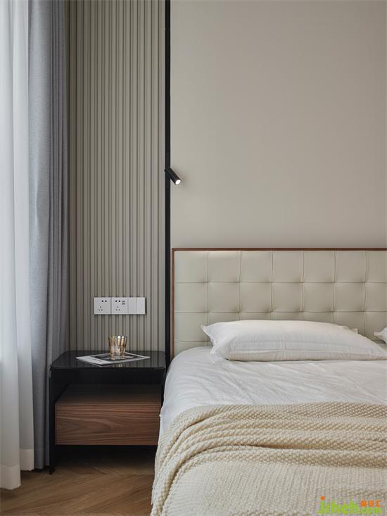 主卧在现代的基础上,选择了成熟稳健的配色,床头背景墙采用米白色+深灰色的撞色组合,搭配整排的白色衣柜,整体呈现宁静和谐的氛围;一侧利用木色的格栅做装饰,增加视觉上的层次感,简约中更显温润和设计感。南京珑玥名邸精装房改造购置米白色的软包床,松软的靠背让倚靠更惬意,带来满满的安全感。
