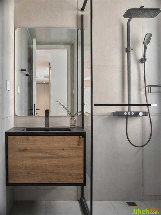 卫生间在黑色+灰色的基础上点缀一抹木色,线条简洁利落,空间干净时尚,南京珑玥名邸精装房改造满足基本需求功能之外,没有过多的装饰,回归真实、简单的生活状态。
