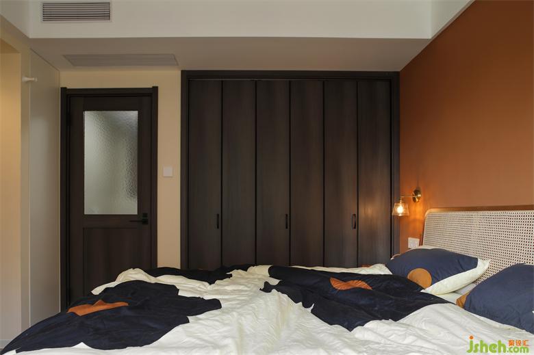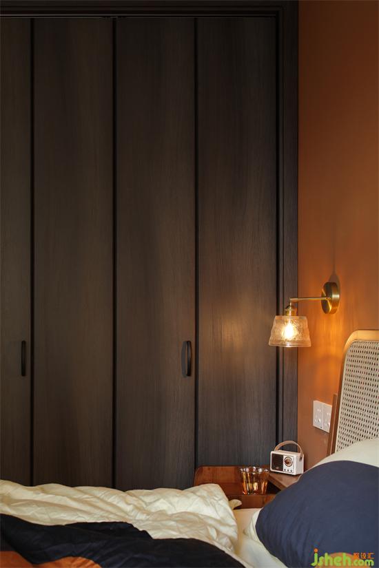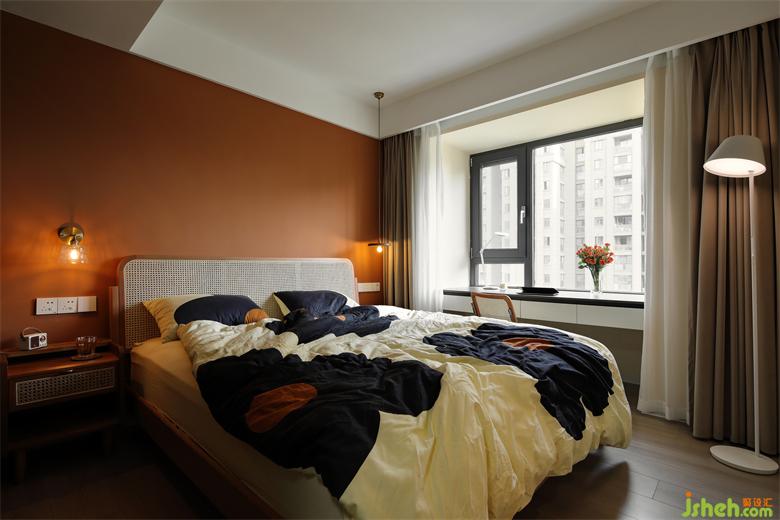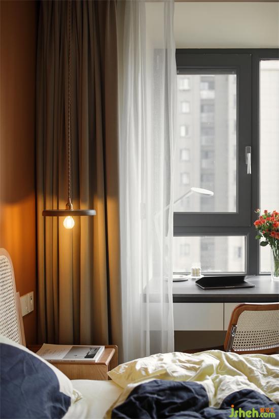主卧的床头背景墙涂刷了立邦的坚果色号,大胆的跳色设计产生了强烈的色彩对比,给空间增添了几分活力,诠释了量身定制的起居环境。购置一款藤编实木床,木质的庄重与藤织的悠闲相结合,简约中透射着复古,自带安静人心的气质。家装设计原来的飘窗拆除之后,定制了悬挑的书桌兼梳妆台,优雅轻盈,婚房设计既满足了屋主在家办公的需要,又保证了女主人的化妆需求;透过光线的牵引,打开窗户,和缓缱绻的暖阳伴着温热的微风入室,一切都慢了下来,春雨润物般地充实自己的心灵。
