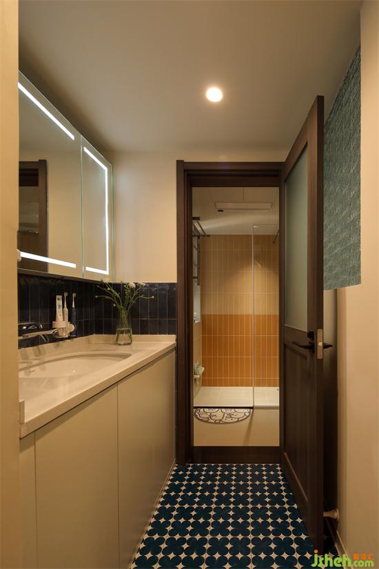 通过墙体重组改造,打造了一处公共区的干区,地面铺贴了蓝色的小花砖,洗手台一侧采用同色的长条砖铺贴半墙,带来一丝浓郁的复古风情,区域内的小小点缀就给屋内制造了惊喜,体现了屋主的个人情怀。与奶白色形成的撞色,丰富了视觉的层次感,精致中充满内涵。