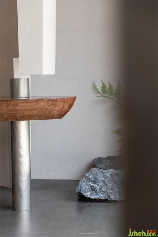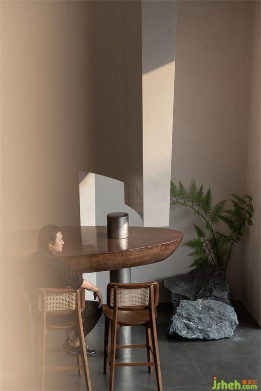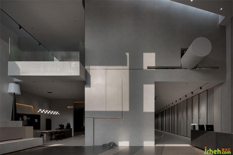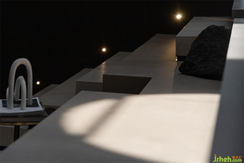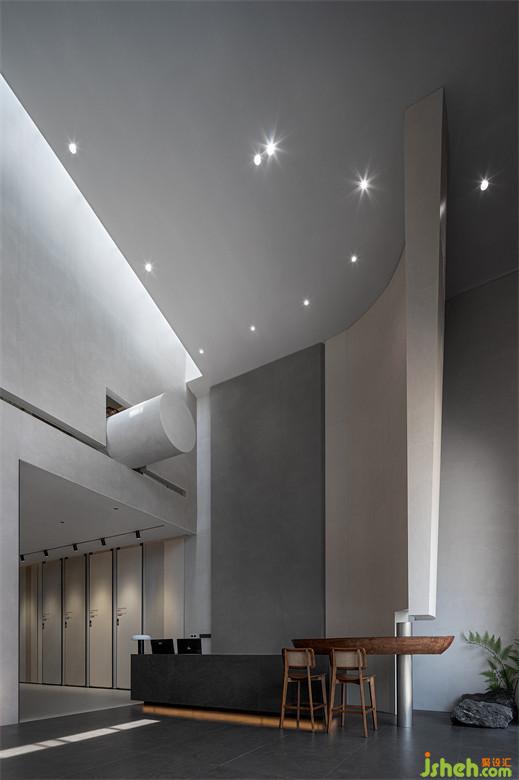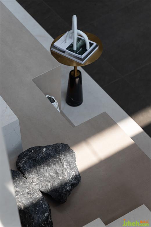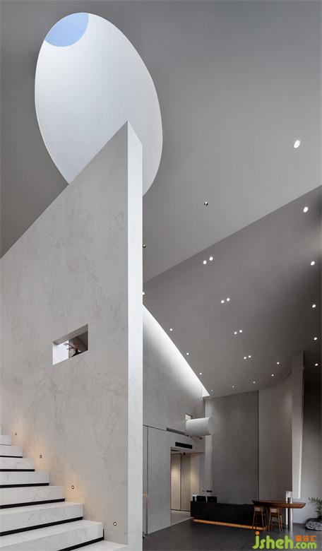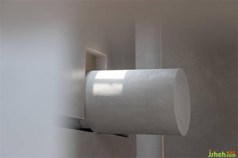 右侧顶面与立面在交叉之际预留了缝隙,光晕倾洒,让人注意到了圆柱结构,其形体尺度刚好契合天井镂空的空间,再次强调了互补意趣。