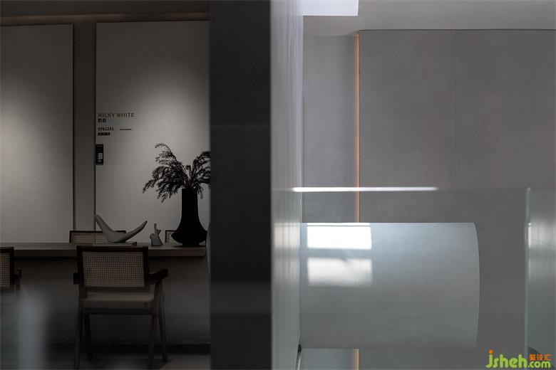 右侧顶面依循结构线排布单点灯,又于居中位置增添双点灯,瓷砖展厅设计巧妙化解暗夜星辰意象与实际照明需求的矛盾,与左侧天井象征的白昼艳阳形成互补关系。