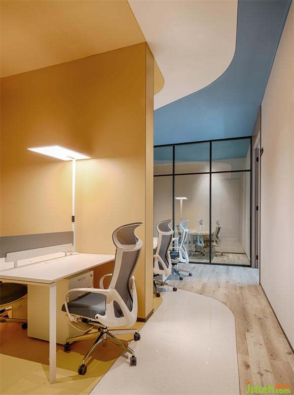 The design style of different functional areas is different. The conference room chooses blue as the space base, which creates serious atmosphere and is more conducive to concentration. Yellow is the main color in the office area, which is good for keeping full vitality. The drink bar is clear blue, filtering out the exhaustion.