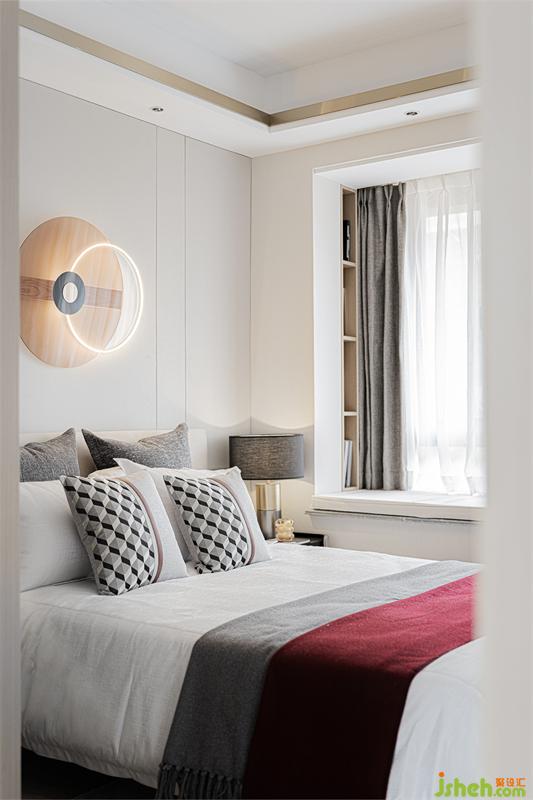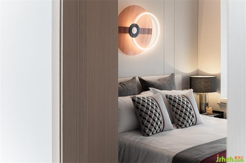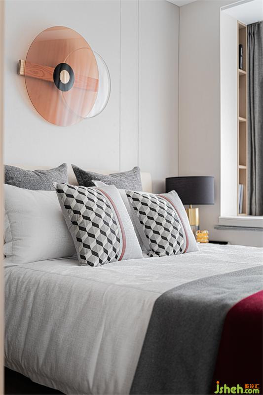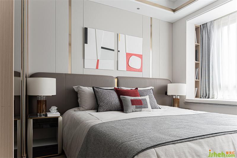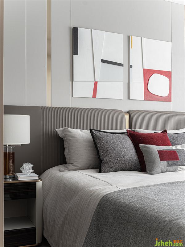 卧室的陈设被黑白灰加持,红色的点缀中和了空间配色的单调,形式多样的装饰画与背景装饰灯让室内气质透着时髦与灵动。
