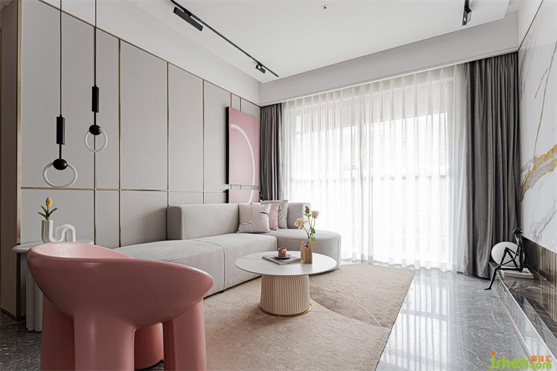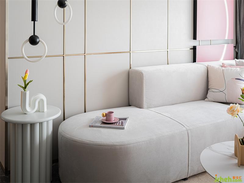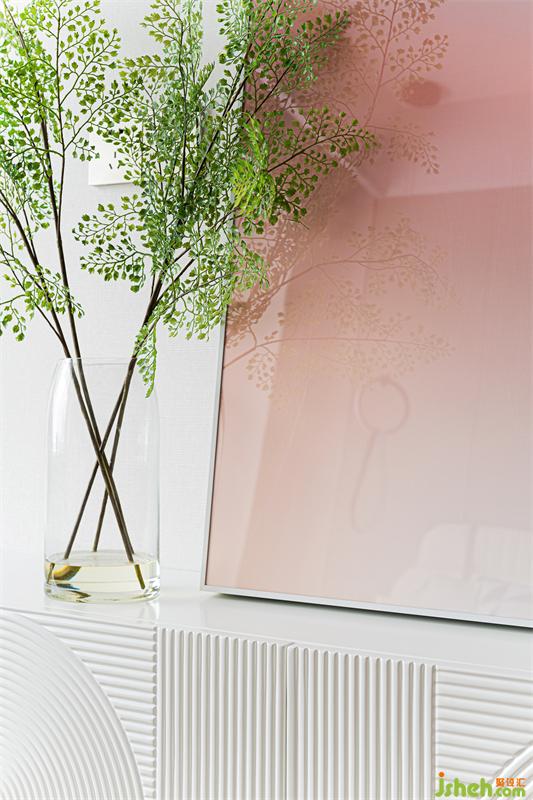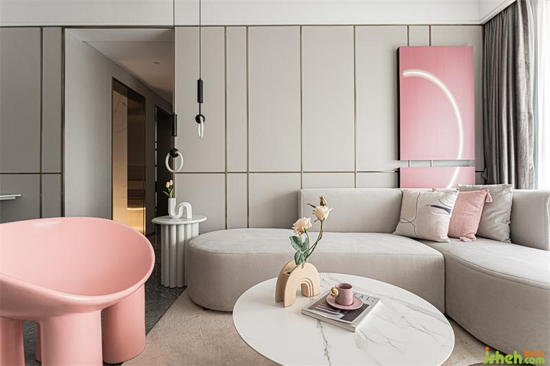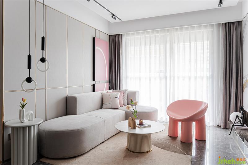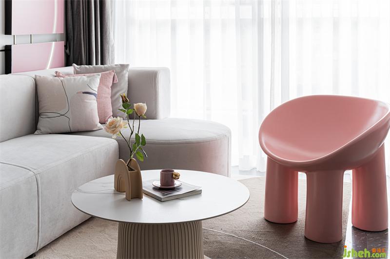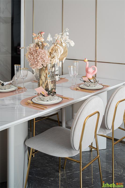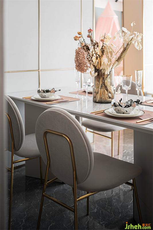 粉色给人的既定印象是少女心,空间以粉色为主,形塑现代文艺感。客餐厅用粉色暖色系为配色,为空间注入一丝甜甜的亮点,餐厅精致的粉色餐具与摆件搭配,和客厅的粉色扶手椅相呼应,空间略显清新优雅。