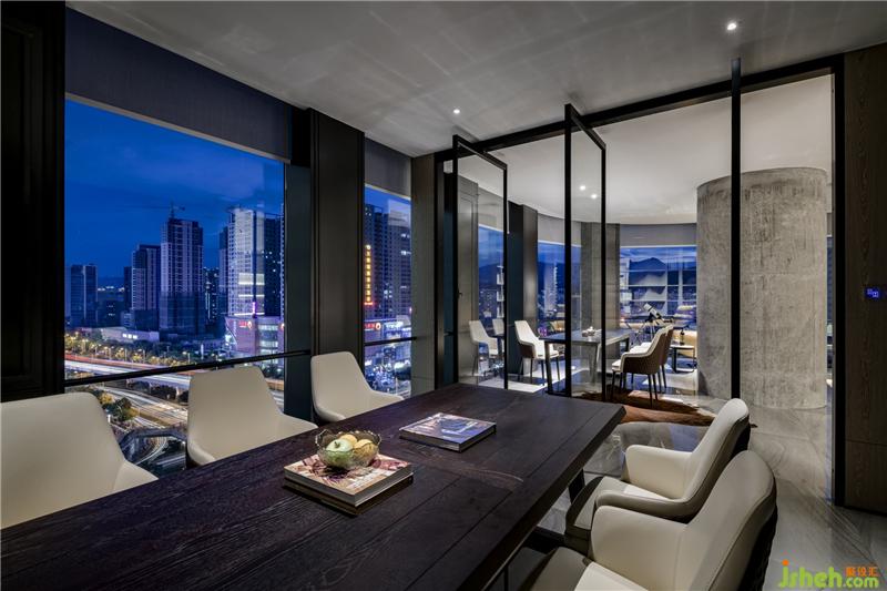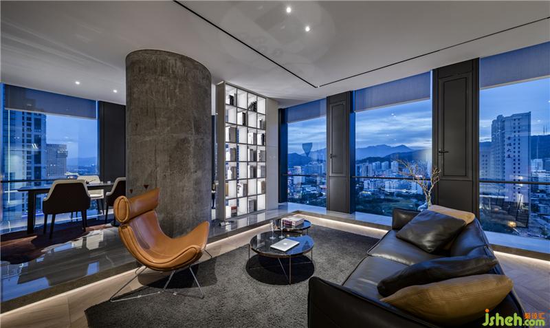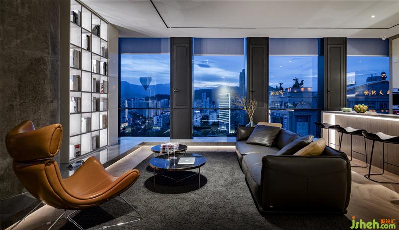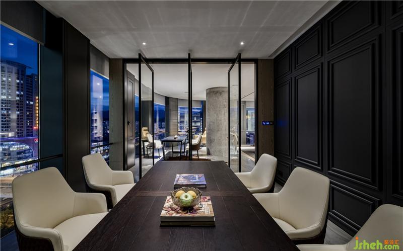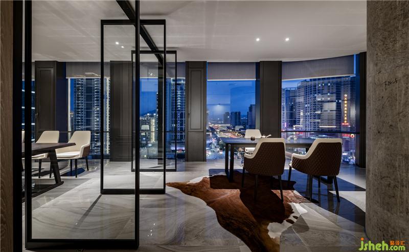 俯瞰整条向南延伸的龙岩大道,洽谈区与茶室是整个工作室观景的最佳位置。三开的玻璃门兼具隐私与透明,保持与其他区域的通透与联接,契合精致、稳重的空间需求。巧妙使用蓝色点缀黑白的空间,带来亮色的感官体验,呈现安静却不失力度的张力。