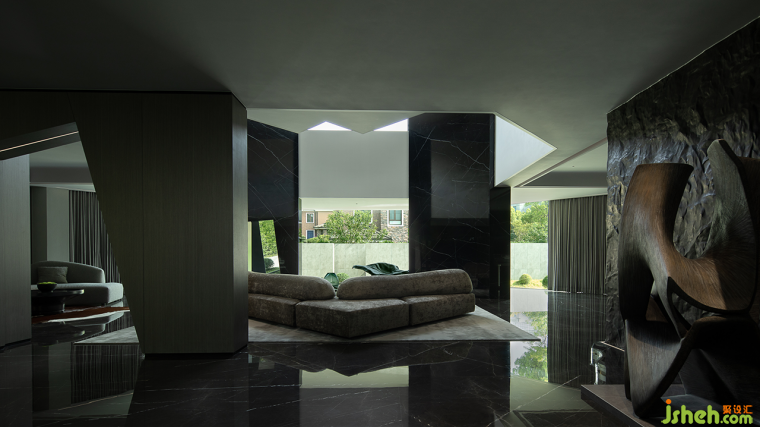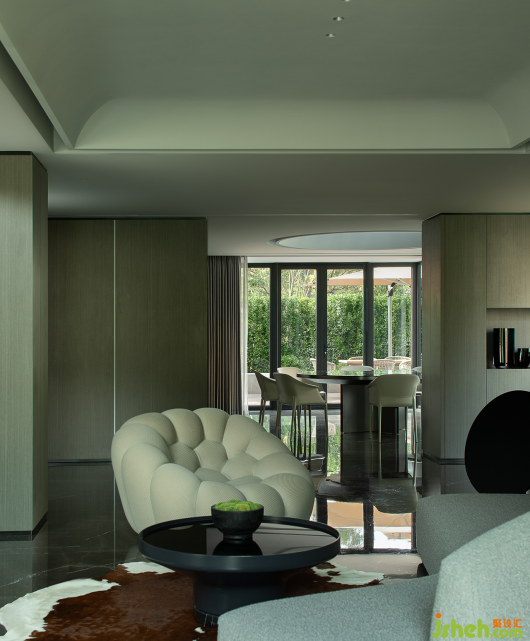 家庭活动区的中心,超大的V字形沙发围绕着深黑茶几,面朝庭院。双层挑高的设计与明亮的玻璃,共同营造出磅礴大气的视觉感受,而自然光线与木质墙板的搭配,又酝酿出温馨与柔和。无论是亲友欢聚,还是三两人斜倚闲谈,空间都给予人无限的自在与舒适。