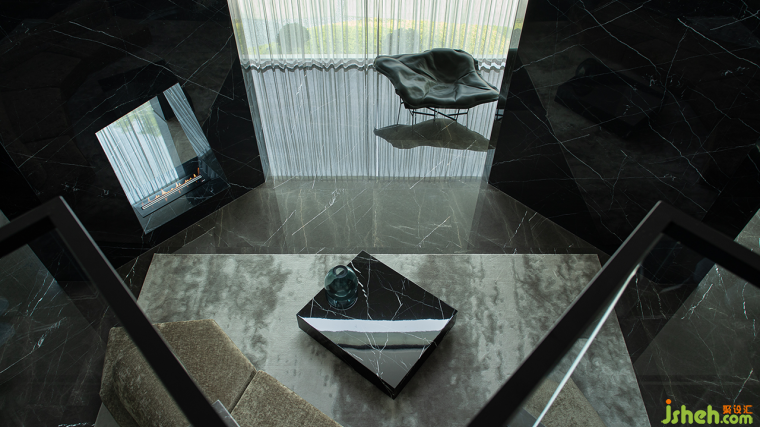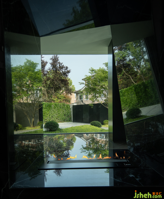 斜设的壁炉,以大理石的光泽与空间的通透,与火焰共谱一曲冰与火的冷暖歌谣,既带来奢华的享受,也无形中分隔了空间。